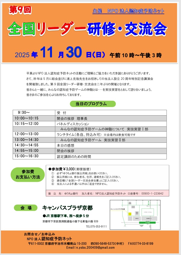 NPO法人認知症予防ネットは認知症発症以前の段階に於いて、脳機能低下の変化を生活面から本人も家族もともに正しく認識し、できる限り脳機能の低下を抑え、発症しても悪化進行を予防し、葛藤のない生活を可能とする地域、換言すれば認知症の人と共に歩むことができる地域づくりを「みんなの認知症予防ゲーム」を通して目指します。そのため「みんなの認知症予防ゲーム」の認知症予防の有効性を理解し、ゲーム内容、伝達方法、各ゲームの意義についてよく理解し、高齢者と共に歩むことの出来るリーダー養成講師を育て厳正な審査にパス者を認定講師として世に送り出すことが目的です。